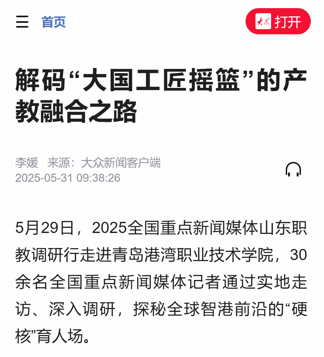 齐鲁壹点:《30余位主流媒体记者走进青岛港湾职业技术学院 解码“大国工匠摇篮”的产教融合基因》