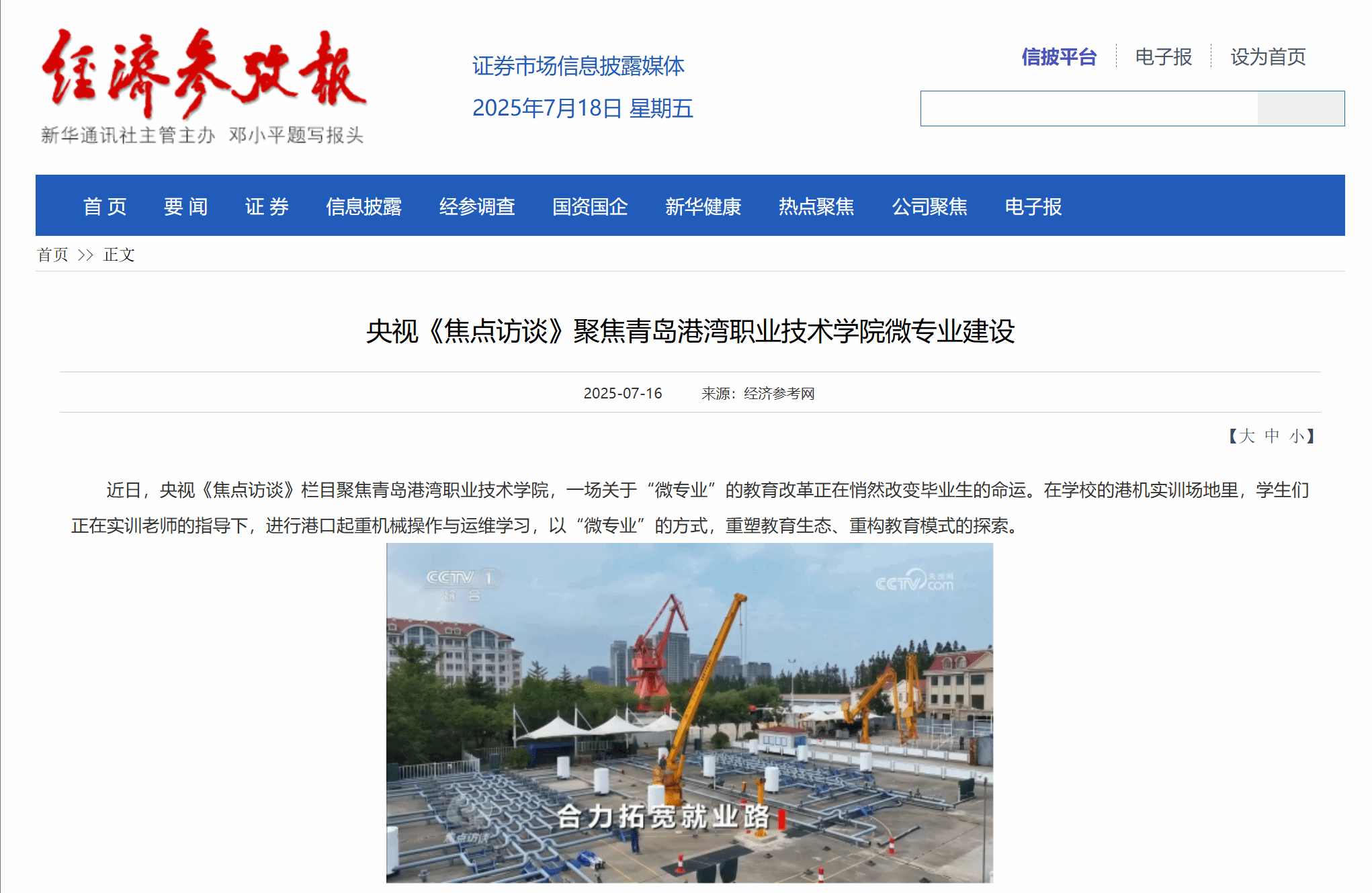 经济参考网:《央视《焦点访谈》聚焦青岛港湾职业技术学院微专业建设》