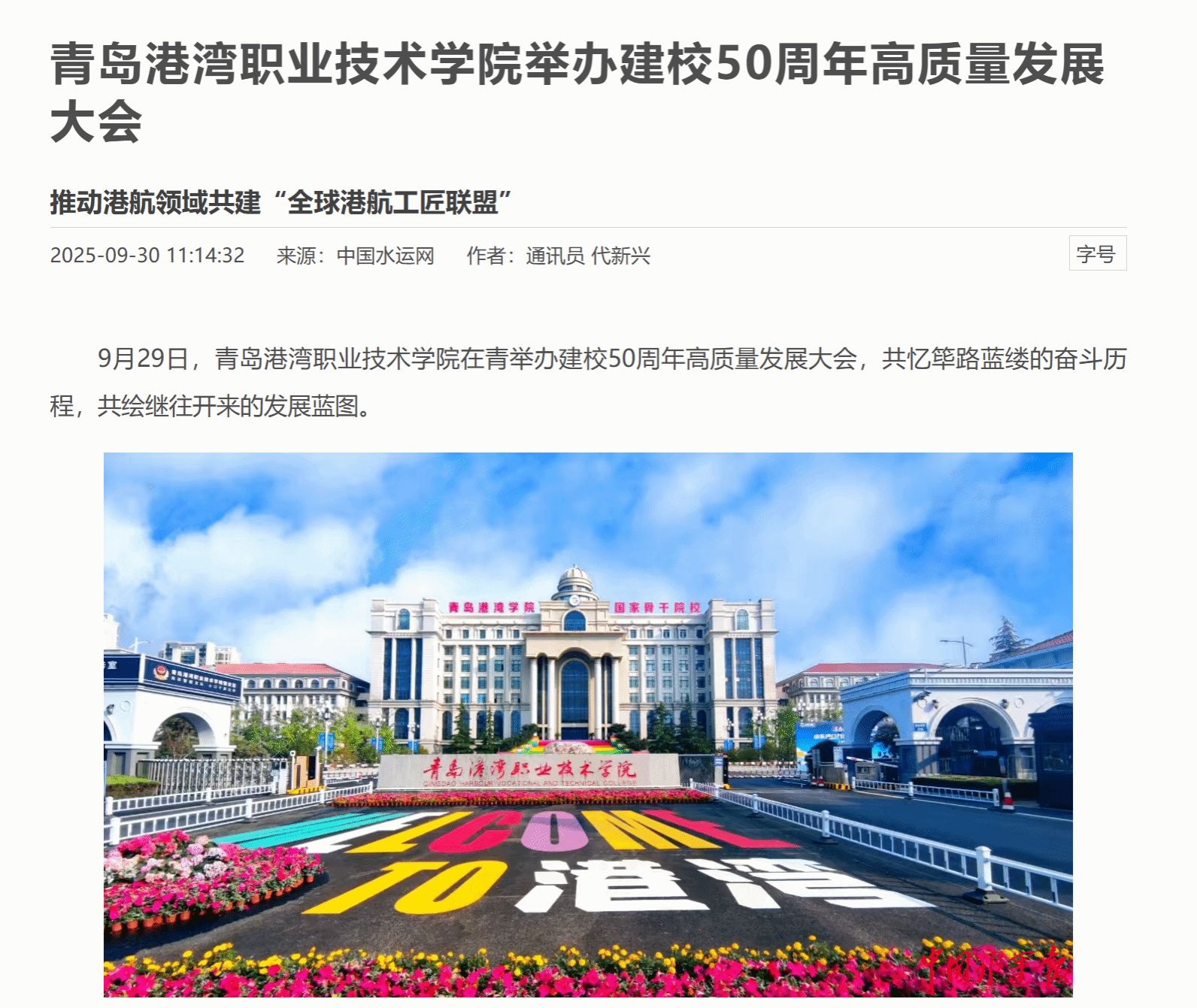 中国水运网:《青岛港湾职业技术学院举办建校50周年高质量发展大会》