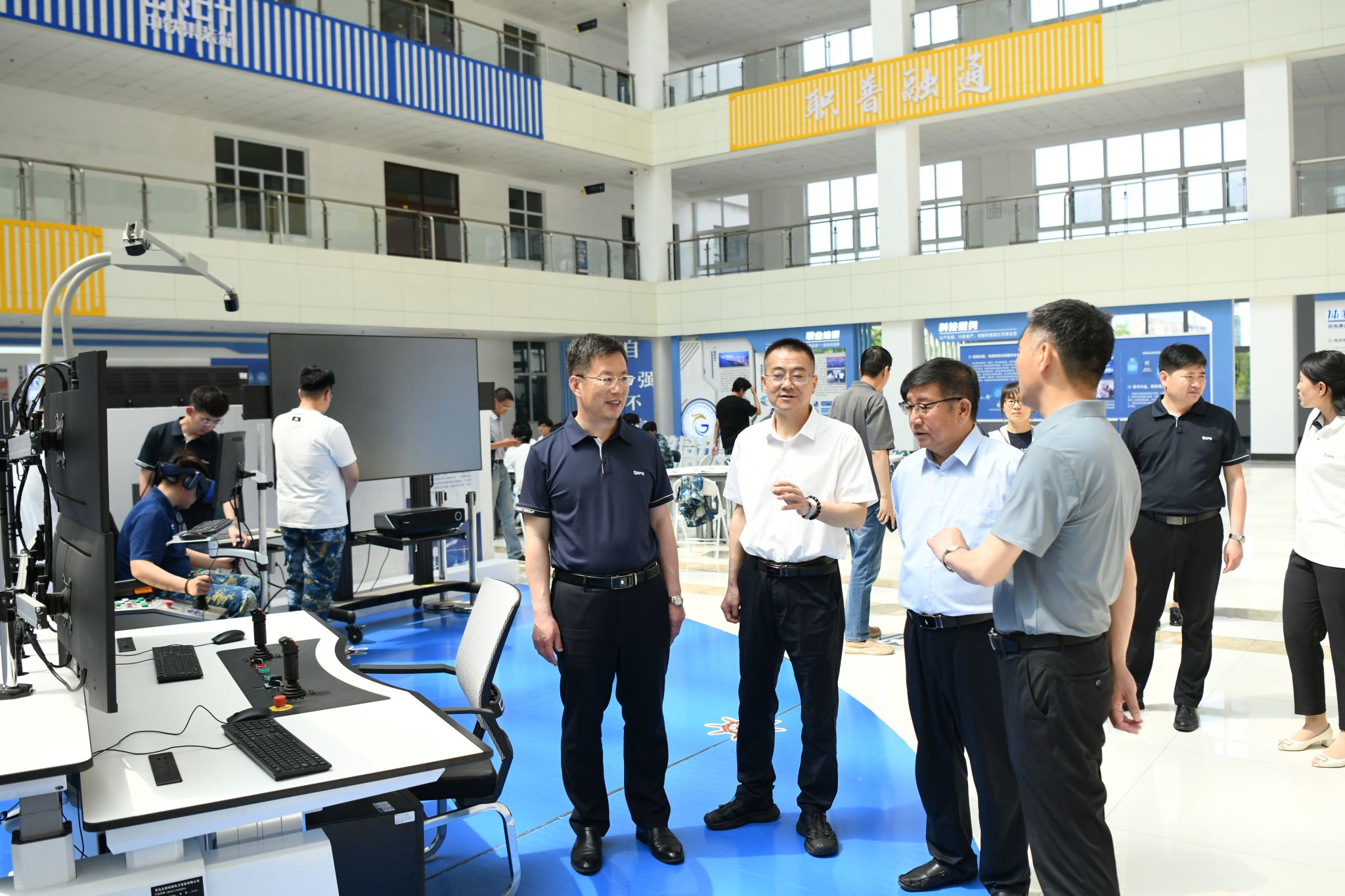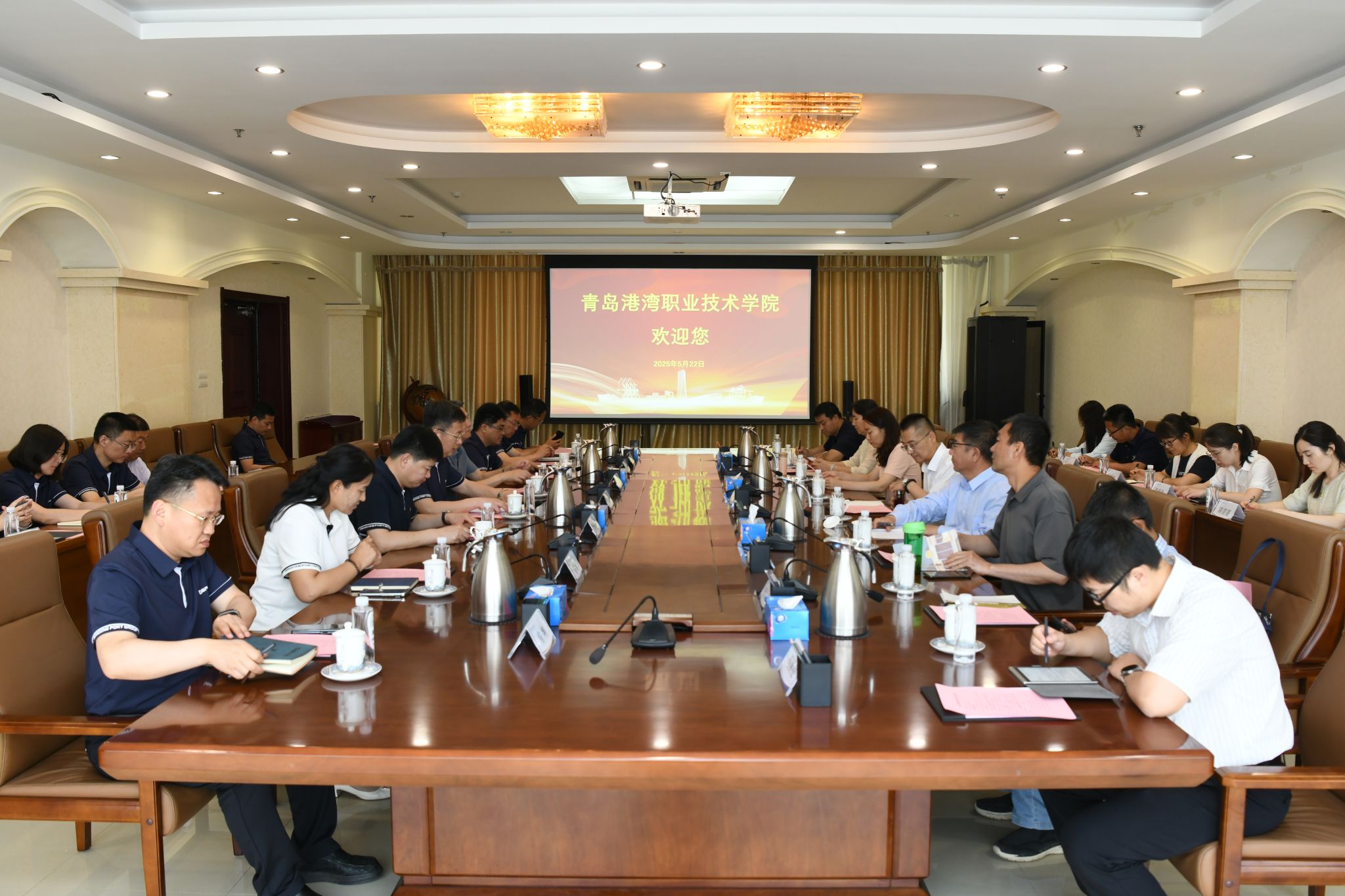 吕安涛一行首先参观了学校文体中心、实训场地和产教融合大厅,一行人对我校良好实训条件和校港一体、工学结合的办学模式表示肯定。参观结束后,宾主双方在608会议室进行了深入交流,座谈会由王海蛟主持。会上,王海蛟对吕安涛一行到校表示热烈欢迎,同时简要介绍了学校情况。吕安涛介绍了山东公路技师学院的基本情况,并高度肯定了学校在职业教育理念创新与实践探索上所做的努力和取得的成绩。在随后的座谈交流中,双方分别从党建引领、体制机制改革、产教融合、信息化管理、后勤管理等九个方面进行了深入交流。
