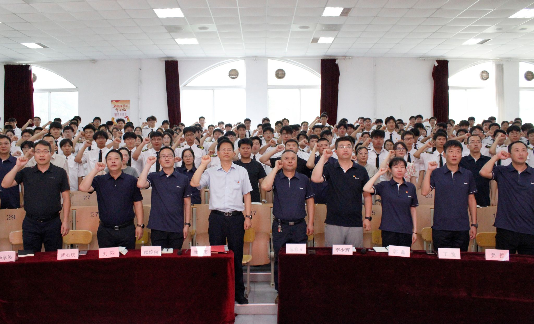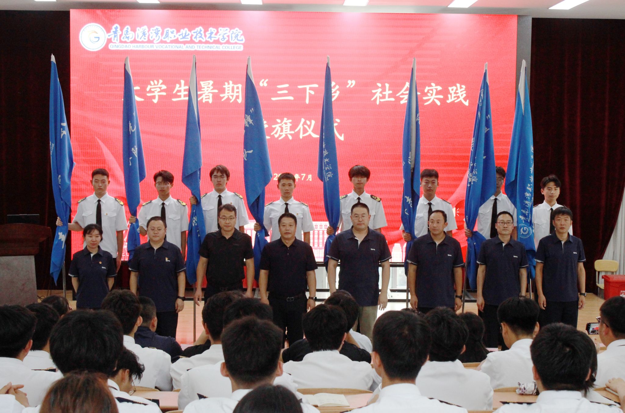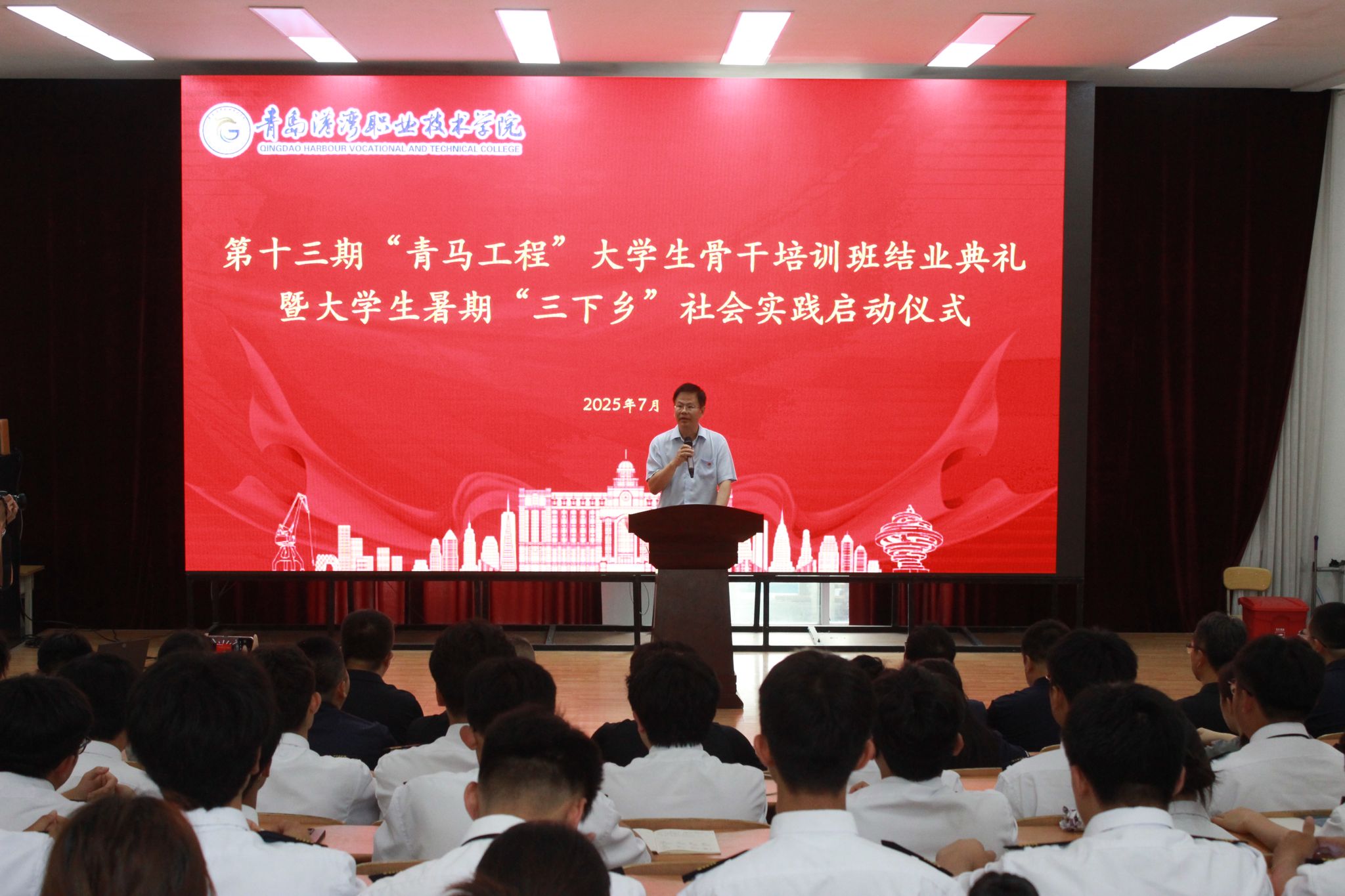 仪式中,学生处副处长李少辉宣读第十三期“青马工程”优秀学员名单。陈纪伟为优秀学员代表颁发荣誉证书。优秀学员代表白新宇同学作精彩发言。团委副书记郭鑫传达《关于开展2025年大学生暑期文化科技卫生“三下乡”社会实践活动的通知》,并和二级学院党总支副书记共同为“三下乡”志愿服务队代表授旗。志愿服务队代表苗雨晨同学领誓,铿锵有力的誓言响彻会场,表达了港湾学子投身火热实践、服务社会发展、贡献青春力量的坚定信念和昂扬斗志。