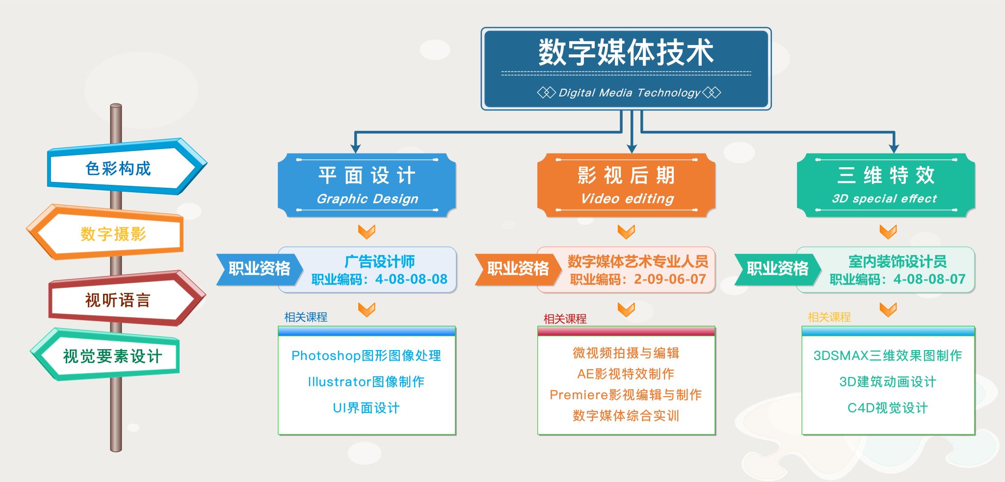 本专业面向数字内容服务、影视节目制作和数字文化创意等行业,培养从事视觉传达设计、界面与交互设计、音视频编辑、数字孪生、数字文创产品设计等工作,具备视觉传达设计员、数字媒体艺术专业人员、全媒体运营师等职业素质,掌握扎实的科学文化基础和数字媒体技术理论、设计创意、媒体制作与应用及相关法律法规等知识,具备科学素养、数字素养、职业道德、创新意识、爱岗敬业的职业精神和精益求精的工匠精神的高技能人才。